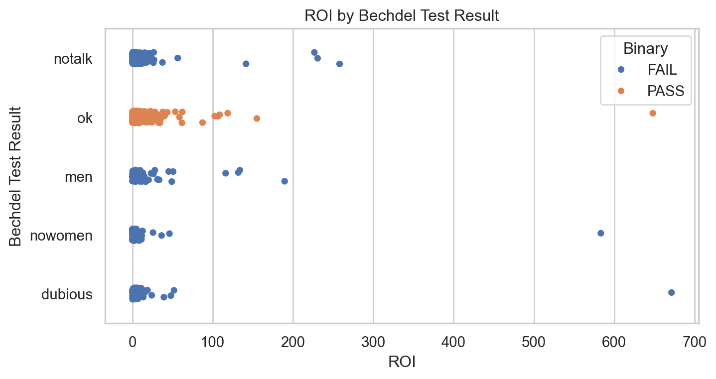What does this plot say about return-on-investment on movies that pass the Bechdel test?