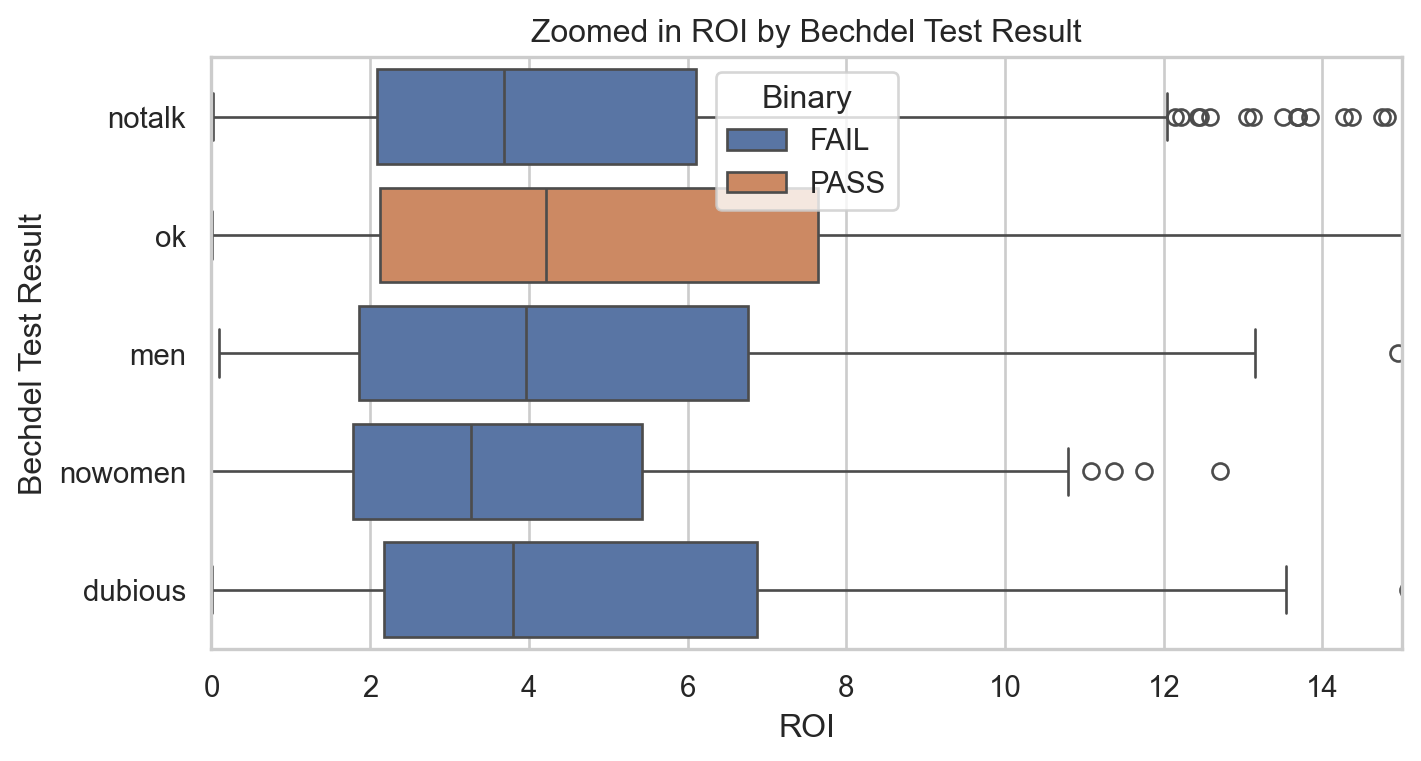 Zoom in: What about this plot makes it difficult to evaluate how ROI varies by Bechdel test result?
