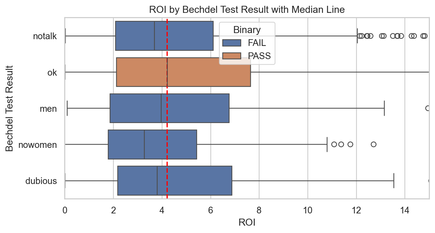 plt.title('ROI by Bechdel Test Result with Median Line')