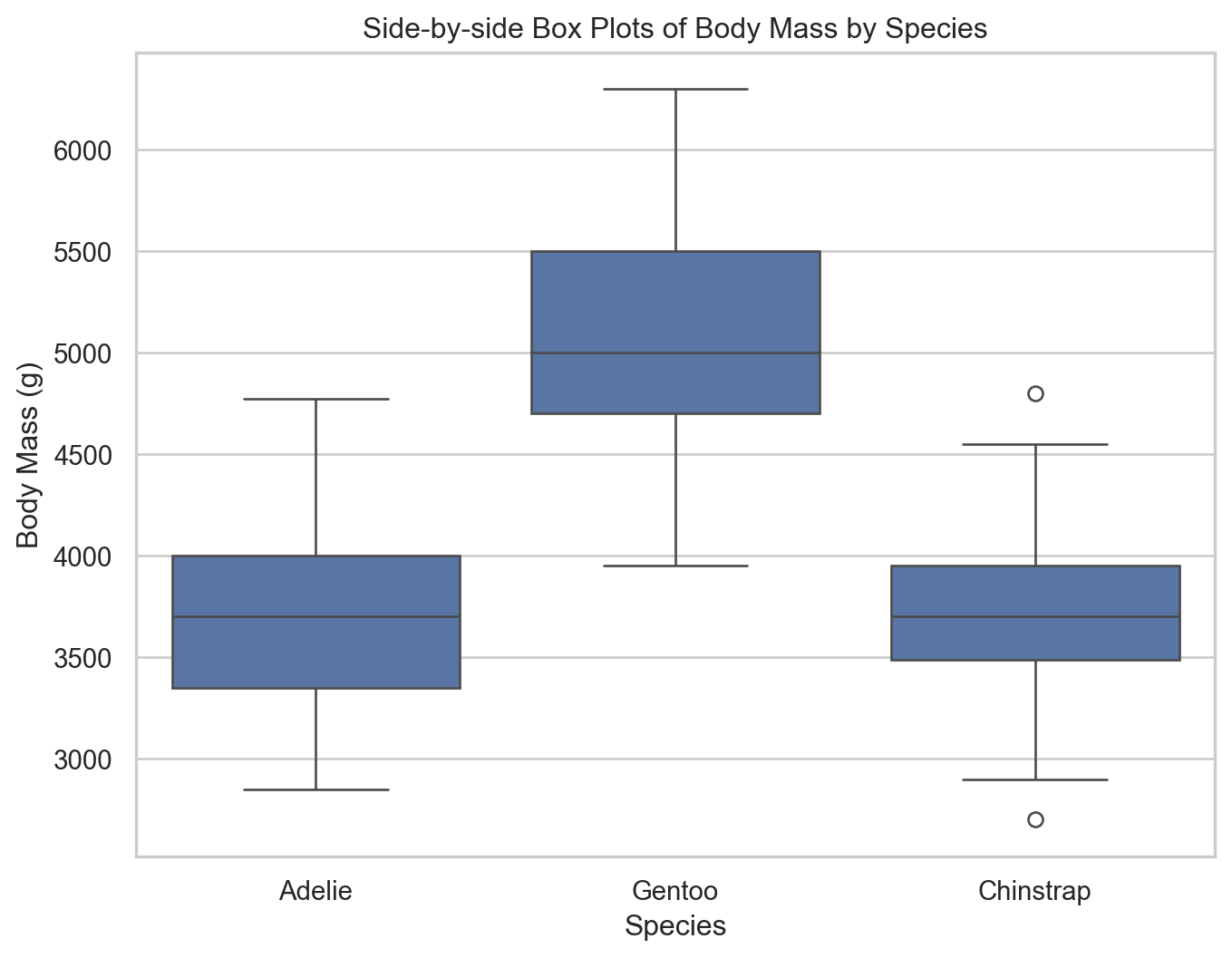 Numerical + categorical: side-by-side box plots, violin plots, etc.