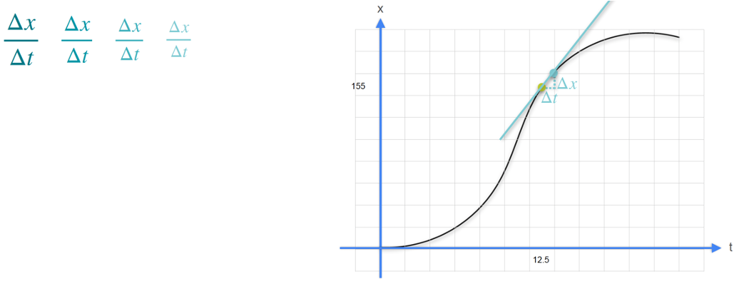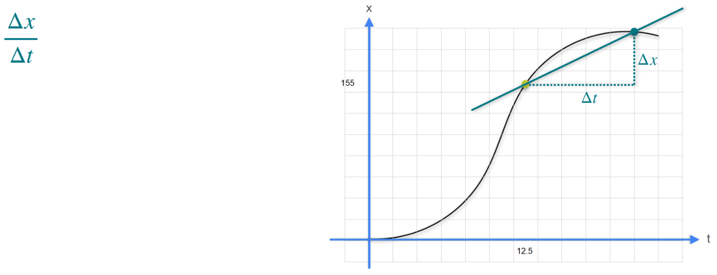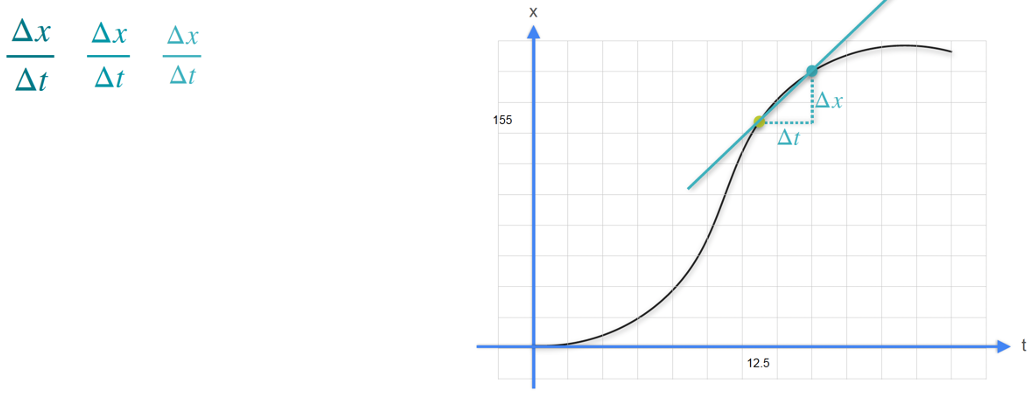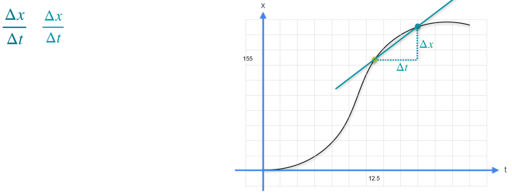 \(\text{slope}=\frac{\text{change in distance}(\Delta x)}{\text{change in time}(\Delta t)}\)