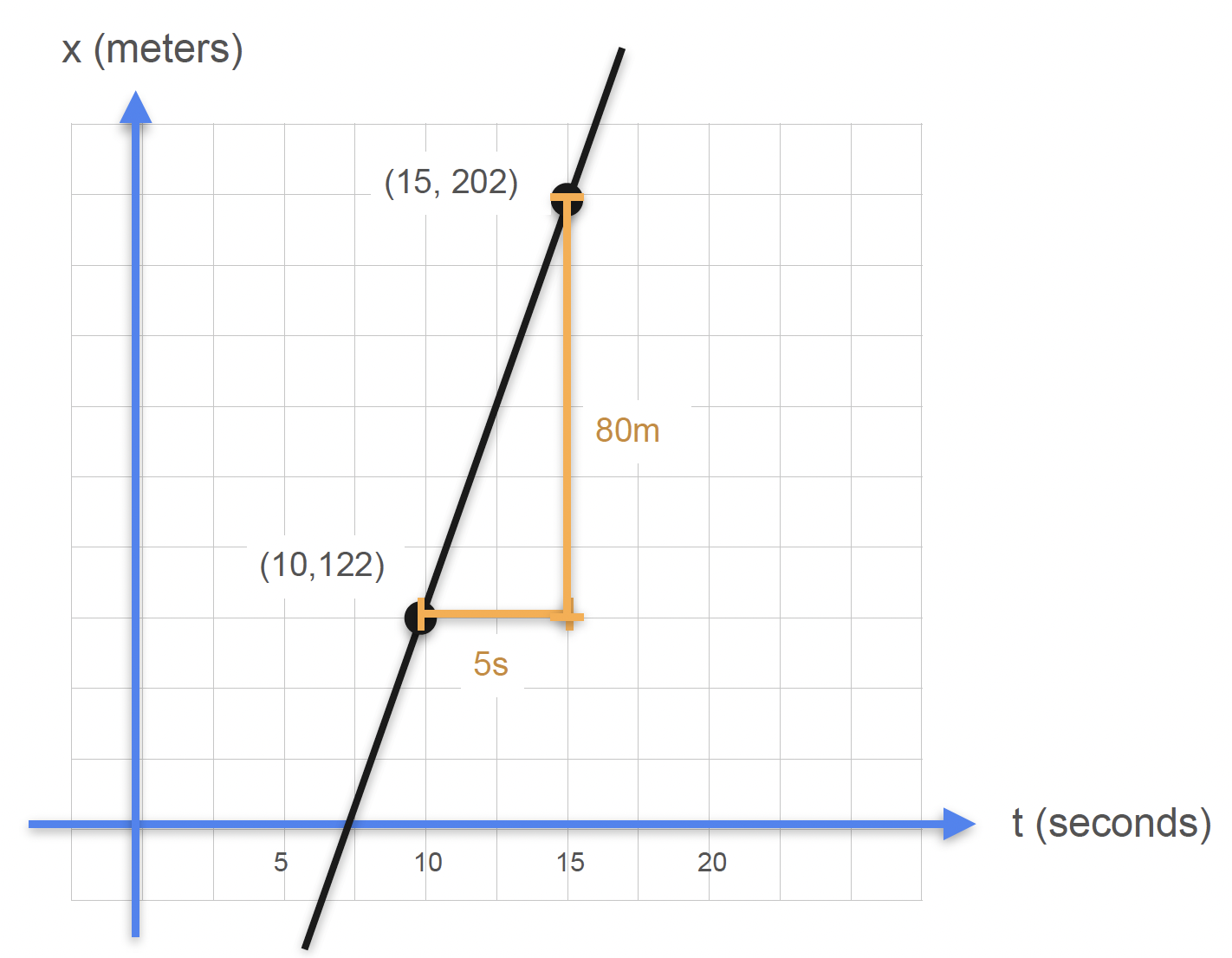 \(\text{slope}=\frac{202m - 122m}{15s-10s}\)